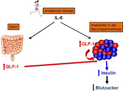 Der arbeitende Muskel produziert ein Molekül namens Interleukin-6 (IL-6), dessen Bedeutung bisher jedoch unklar war. Bekannt ist daneben, dass die L-Zellen im Darm ein Hormon produzieren, das sogenannte Glucagon-like-Peptid-1 (GLP-1). Dieses GLP-1 wird durch Mahlzeiten über den Darm stimuliert und regt die Insulinproduktion an.