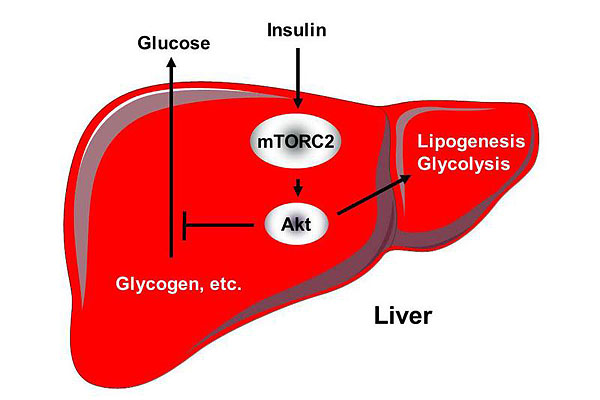 Im gesunden Organismus reguliert Insulin den Blutzuckerspiegel und aktiviert den mTORC2-Signalweg. Bei Mäusen, denen die Forschenden das Gen für mTORC2 in der Leber inaktiviert hatten, waren bereits wenige Wochen nach ihrer Geburt erhöhte Blutzucker- und Insulinwerte messbar. Der Verlust des mTORC2-Regulators führte ausserdem zu einer Insulinresistenz: Die Leberzellen können das Nährstoffangebot im Körper nicht weiter erkennen und bilden trotz steigendem Blutzuckerspiegel laufend neue Kohlenhydrate.