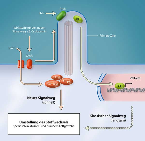 Krebs, Diabetes und Übergewicht haben eines gemeinsam: Sie verändern den zellulären Stoffwechsel. Wissenschaftler vom Max-Planck-Institut für Immunbiologie und Epigenetik in Freiburg und der Medizinischen Universität Wien haben zusammen mit einem internationalen Forscherteam einen neuen Signalweg für den Zellstoffwechsel aufgeklärt.Demnach ermöglicht das Protein Hedgehog über einen bislang unbekannten Signalweg, dass Muskelzellen und braune Fettzellen unabhängig von Insulin Zucker aufnehmen können. Substanzen, die den Signalweg selektiv aktivieren, könnten demnach zur Behandlung von Übergewicht und Diabetes angewandt werden. Mit ihren Ergebnissen können die Forscher auch erklären, warum verschiedene neue Wirkstoffe gegen Krebs in klinischen Studien starke Nebenwirkungen ausgelöst haben.