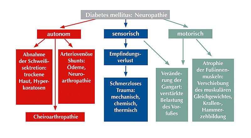 Nach den Ergebnissen des GEHWOL Diabetes-Report 2009, für den knapp 3.800 Diabetiker durch das Markt- und Meinungs­forschungsinstitut INSIGHT Health befragt wurden, fühlen sich die Füße bei einer Polyneuropathie häufig warm, trocken und schmerzlos an. Hier lassen sich drei Formen unterscheiden. Die Veränderung der Gangart und stärkere Belastung des Vorfußes kennzeichnen die motorische Neuropathie. Den Verlust von Empfindungen, auch Schmerzen, bezeichnen Mediziner als sensorisch.