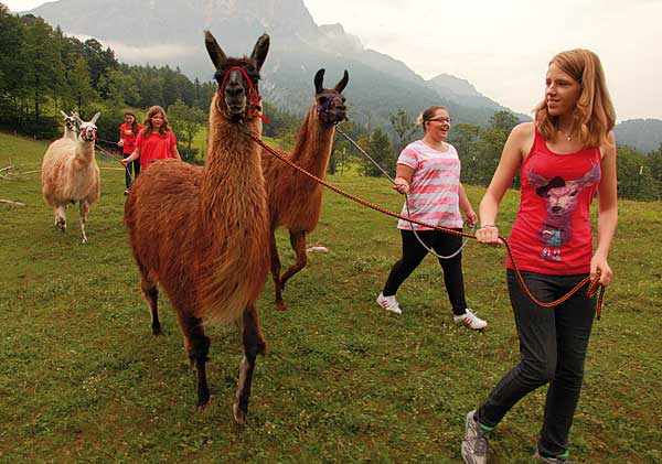So kam es, dass Jaquelin (12), Tamara (13), Samira (14), Katja (16) und Regina (16) mit Lamas durch die Berchtesgadener Berge wanderten. Dabei erfuhren sie von Lama-Experten Klaus ganz Erstaunliches über die südamerikanischen Tiere: "Lamas sind allesamt Diabetiker, denn sie haben grundsätzlich kein Insulin." "Na, dann passen die ja zu uns", kommentiert die blonde Regina verschmitzt.