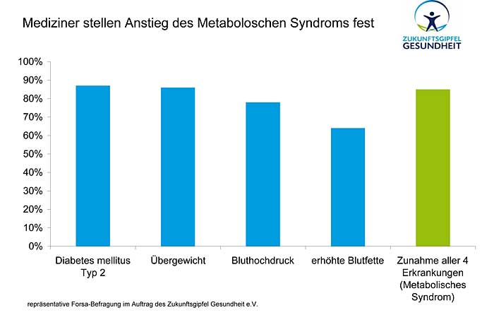 85 Prozent der Hausärzte in Deutschland stellen eine Zunahme des Metabolischen Syndroms fest. Der Begriff bezeichnet die Kombination aus starkem Übergewicht, Fettstoffwechselstörungen, Bluthochdruck und beginnendem Diabetes. Am häufigsten tritt das sogenannte tödliche Quartett in den Jahren zwischen 50 und 64 auf. Doch auch viele jüngere Menschen sind betroffen: 41 Prozent sind im Alter zwischen 35 und 49 Jahren. Das zeigt eine repräsentative Forsa-Befragung von 100 Allgemeinmedizinern im Auftrag des Zukunftsgipfel Gesundheit e.V. Problem: Die Krankheit wird immer noch unterschätzt, dabei ist sie ein wesentlicher Auslöser für Herzinfarkt und Schlaganfall.Bereits jeder vierte Deutsche leidet am Metabolischen Syndrom, schätzen Experten. Die befragten Hausärzte gaben an, dass jede der vier Zivilisationskrankheiten, die bei der Erkrankung in Kombination auftreten, in den letzten zehn Jahren zugenommen hat: 87 Prozent der Mediziner stellen einen Anstieg von Diabetes Typ 2, 86 Prozent von Übergewicht, 78 Prozent von Bluthochdruck und 64 Prozent von erhöhten Blutfettwerten fest. 85 Prozent beobachten eine Zunahme aller vier Erkrankungen, mehr als jeder dritte Befragte (37 Prozent) sieht sogar einen starken Anstieg.
