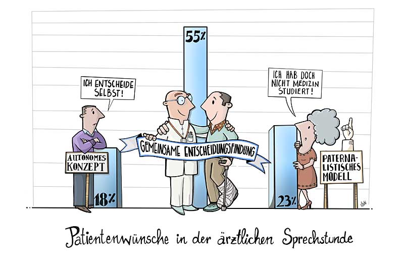Bildunterschrift: Cartoon - Patientenwünsche in der ärztlichen Sprechstunde