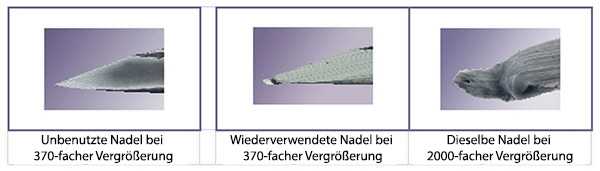 Bildunterschriften: Pen-Nadeln neu und gebraucht in der Vergrößerung (Bild 1) und Vorteile der kurzen Nadeln, die nicht den Muskel treffen (Bild 2).