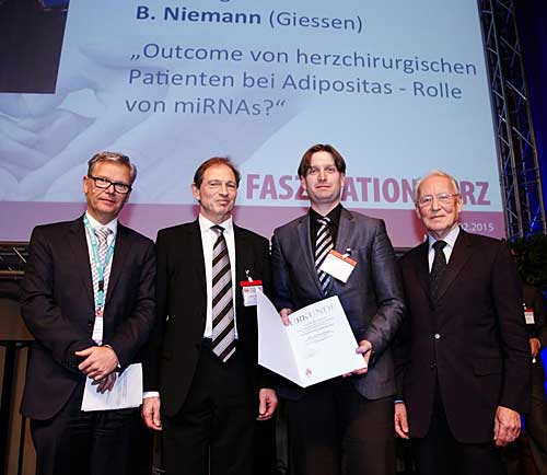 Signale zwischen Herzfettgewebe und Herzmuskelgewebe werden durch Fettgewebsbotenstoffe (Adipokine) und kleine Ribonukleinsäuren (microRNAs) vermittelt. Die Effekte dieser Signale für die Herzleistung und Energieversorgung des Herzmuskels während einer koronaren Bypassoperation zu bestimmen und zur Risikoabschätzung bei jüngeren adipösen Patienten zu nutzen, ist Ziel eines von der Deutschen Stiftung für Herzforschung (DSHF) mit der Dr. Rusche-Projektförderung ausgezeichneten Forschungsvorhabens von Priv.-Doz. Dr. med. Bernd Niemann, Ltd. Oberarzt der Klinik für Herz-, Kinderherz- und Gefäßchirurgie am Universitätsklinikum Gießen und Marburg (UKGM), Standort Gießen. Das mit rund 60.000 Euro für die Projektdauer von zwei Jahren geförderte Vorhaben trägt den Titel "Bedeutung der microRNA-vermittelten Interaktion zwischen epikardialem Fettgewebe und Myokard für die Adipositas-assoziierte perioperative metabolische und funktionelle Reduktion". "Wir sehen in dem Vorhaben einen wichtigen Beitrag, die Rolle von Signalmolekülen und Fettgewebshormonen im Herzen fettleibiger Menschen für die Herzleistung dieser Patienten während und nach einer Herzoperation besser zu verstehen", begründet Prof. Dr. med. Hellmut Oelert, Vorsitzender des Wissenschaftlichen Beirats der DSHF, die Förderung.