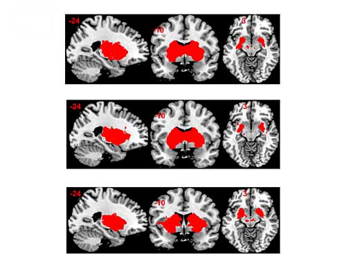 Bildunterschrift: Im Belohnungssystem im Gehirn sind die Unterschiede zwischen dem Placebo (oben) und den zwei Zuckerarten Glukose (Mitte) und Fruktose (unten) deutlich zu erkennen, wie das MRI-Bild zeigt.