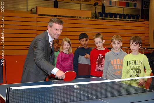 Bildunterschrift: Thomas Geisel (Oberbürgermeister der Landeshauptstadt Düsseldorf) beim Tischtennis-Training mit Drittklässlern der Rochus-Schule, einer Projektschule von SMS.