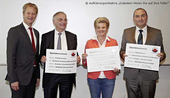 Anlässlich der Jahrestagung der Deutschen Diabetes Gesellschaft (DDG) fand am 4. Mai 2016 in Berlin eine Spendenübergabe zur Praxis-Spenden-Aktion der Aufklärungsinitiative "Diabetes! Hören Sie auf Ihre Füße?" an wohltätige Diabetes-Projekte statt. Spender ist das Unternehmen WÖRWAG Pharma, das die Aufklärungsinitiative zur diabetischen Neuropathie ins Leben gerufen und die Praxis-Spenden-Aktion initiiert hat. Dr. Marcus Wörwag, Geschäftsführer von WORWÄG Pharma, und Professor Dan Ziegler, Vorsitzender des wissenschaftlichen Beirats der Aufklärungsinitiative und Sprecher der Arbeitsgemeinschaft "Diabetes und Nervensystem" der DDG, überreichten gemeinsam Spenden im Wert von insgesamt 16.000 Euro. Davon gingen 10.000 Euro an das "Diabetes-Präventionsprojekt" (DiaPräv) des Instituts für Ernährungsmedizin der TU München und der Deutschen Diabetes-Stiftung (DDS) sowie weitere 4.000 Euro an das Projekt "Life for a Child" und 2.000 Euro an "Insulin zum Leben".Bei der deutschlandweiten Praxis-Spenden-Aktion "Sie knipsen, wir spenden!" rief die Aufklärungsinitiative "Diabetes! Hören Sie auf Ihre Füße?" engagierte Ärzte und ihre Praxis-Teams dazu auf, kreative Fotos in Verbindung mit einem passenden Leitgedanken einzusenden, mit denen sie auf die diabetische Neuropathie aufmerksam machen. Ziel der Aktion war es, die Aufklärung über die diabetische Neuropathie zu fördern und gemeinnützige Diabetes-Projekte zu unterstützen. Jedes eingereichte Foto generierte eine Spende von WÖRWAG Pharma in Höhe von 10 Euro an das "Diabetes-Präventionsprojekt" (DiaPräv). Der so erzielte Spendenbetrag wurde am Ende von WÖRWAG Pharma auf eine Summe von 10.000 Euro aufgerundet.