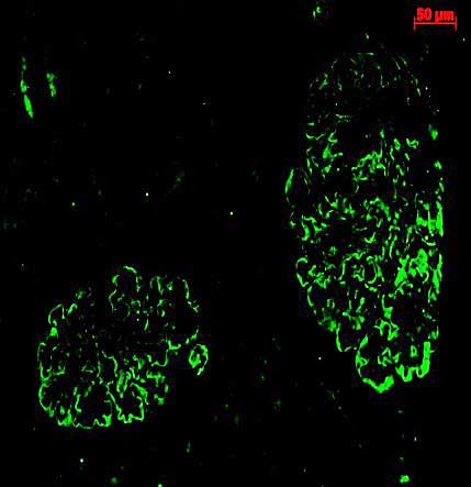 Bildunterschrift: Ein mikroskopischer Schnitt einer menschlichen Niere zeigt die Nierenkörperchen (in grün), die für die Bildung des Primärharns verantwortlich sind.