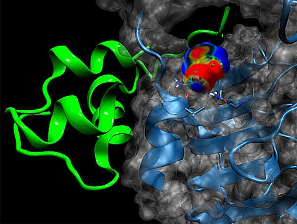 Bildunterschrift: Bindung des Insulin-Analogons (grün) an seinen Rezeptor (hellblau). Die Oberfläche des Rezeptors ist in transparentem grau dargestellt.