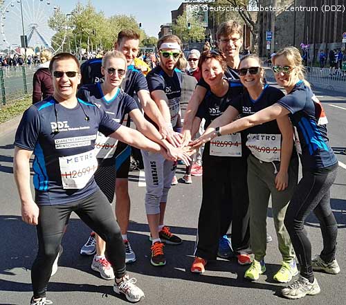 Bei sonnigem, aber windigem Wetter sind zwei Staffeln des Deutschen Diabetes-Zentrums am Sonntag beim Metro Group Marathon in Düsseldorf an den Start gegangen. Insgesamt starteten die acht Läuferinnen und Läufer mit rund 12.000 Staffelläufern auf eine abwechslungsreiche Strecke. So wurden Düsseldorfer Wahrzeichen wie die Tonhalle, der Fernsehturm, der Hafen und die Königsallee begleitet von den Anfeuerungsrufen der Zuschauer erlaufen."Regelmäßige Bewegung wie Laufen ist eine ideale präventive Maßnahme, um den Stoffwechsel zu aktivieren und damit Diabetes vorzubeugen", erklärt Prof. Dr. Michael Roden, Wissenschaftlicher Geschäftsführer und Vorstand am DDZ. "In Deutschland erkranken rund 600.000 Menschen jedes Jahr neu an Diabetes. Zu den wichtigsten Risikofaktoren für einen Typ-2-Diabetes gehören familiäre Veranlagung, Umweltfaktoren aber auch ein zu ungesunder Lebensstil. Dagegen wollen wir etwas tun und ein Zeichen setzen", so Roden weiter.