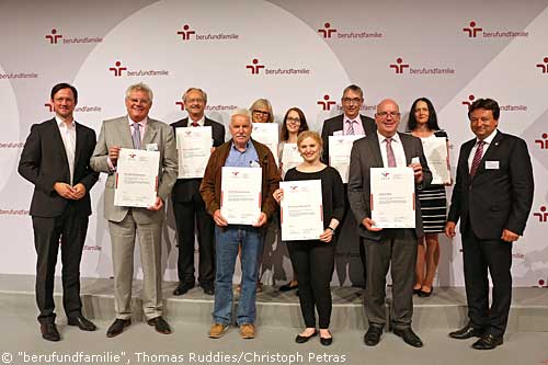 Bildunterschrift: Das Zertifikat nahm Andreas Fidelak (3. v. links), Vorstand des Deutschen Diabetes-Zentrums (DDZ), von Oliver Schmitz (rechts außen), Geschäftsführer der berufundfamilie Service GmbH, entgegen.