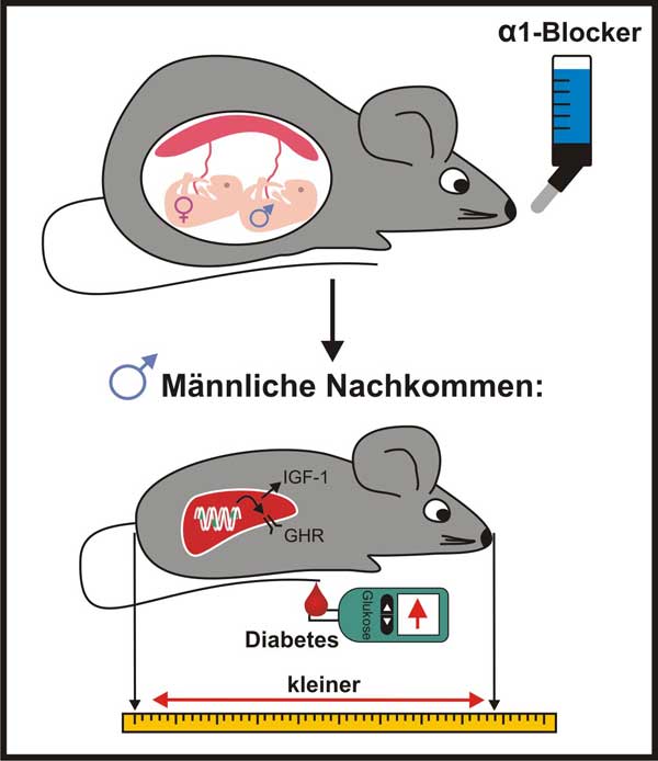 Bluthochdruck in der Schwangerschaft ist eine häufige und ernstzunehmende Komplikation, die unbehandelt schwerwiegende Konsequenzen für Mutter und Kind haben kann. Leider können viele gängige Medikamente wie ACE-Inhibitoren nicht eingesetzt werden, da sie entweder nachweislich das Risiko von Fehlbildungen des Fetus erhöhen oder nicht ausreichend untersucht sind, um einen sicheren Einsatz während der Schwangerschaft zu gewährleisten. So sind die Behandlungsmöglichkeiten für schwangere Frauen eingeschränkt, und je nach nationalen Richtlinien kommen auch Alpha/Beta-Kombiblocker wie Labetalol oder Alpha1-adrenerge Blocker wie Prazosin zum Einsatz.Ein Forschungsteam des Center of Brain, Behavior and Metabolism (CBBM) der Universität zu Lübeck konnte im Mausmodell zeigen, dass eine Alpha1-adrenerge Blockade während der Schwangerschaft zu einem verringerten Wachstum und im Erwachsenenalter zu Diabetes führen kann. Interessanterweise zeigten nur die männlichen Nachkommen der behandelten Mäuse dieses Krankheitsbild. Die Studie wurde in in "Molecular Metabolism" online am 1. Juli 2017 veröffentlicht.