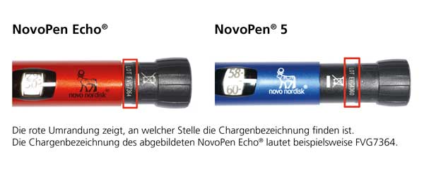 Die betroffenen 7-stelligen Chargenbezeichnungen von NovoPen Echo und NovoPen 5 beginnen hinter dem Wort "LOT". Alle Patronenhalter der Chargen, die mit einer der folgenden Buchstabenfolgen bzw. Buchstaben-Zahlen-Kombinationen anfangen, sollen ersetzt werden: