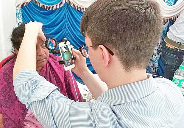 Bildunterschrift: Augen-Screening mit umgerüsteten Smartphones in Indien - Dr. Maximilian Wintergerst untersucht das Auge einer Patientin mit einer indirekten Smartphone-Lösung.
