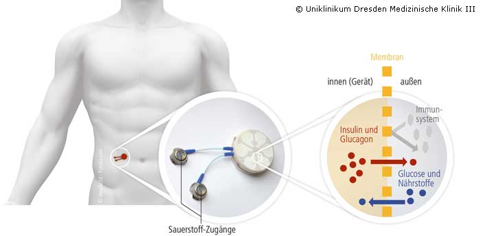 Diabetes mellitus Typ 1 ist eine Autoimmunerkrankung, die zur irreversiblen Zerstörung von insulinproduzierenden Betazellen, auch Inselzellen genannt, führt. In den letzten Jahrzehnten wurden erhebliche Fortschritte bei Betazellersatztherapien erzielt. Der Mangel an geeigneten Spenderorganen und die Notwendigkeit einer dauerhaften Unterdrückung des Immunsystems, um eine Abstoßung zu verhindern, schränken jedoch eine weiter verbreitete Anwendung dieser Strategien kritisch ein. In einer aktuellen Publikation im Fachblatt "Proceedings of the National Academy of Sciences of the United States of America" (PNAS) präsentiert eine internationale Forschergruppe aus Diabetes-Spezialisten und Chirurgen um die Dresdner Wissenschaftler Privat-Dozentin Dr. Barbara Ludwig, Dr. Stefan Ludwig und Prof. Stefan R. Bornstein vom Universitätsklinikum Carl Gustav Carus eine experimentelle Studie mit einer künstlichen Bauchspeicheldrüse.