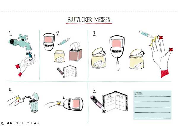 Bildunterschrift: Mit dieser Sketchnote kann das Praxisteam einprägsam veranschaulichen, wie der Patient beim Blutzucker messen vorgeht und was er dabei jeweils beachten muss. Während des Gesprächs können patientenindividuelle Informationen ergänzt werden. Sketchnotes sind derzeit zu neun Themenbereichen erhältlich.