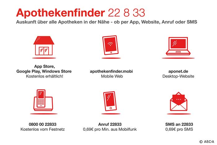 Innerhalb Deutschlands bietet der "Apothekenfinder 22 8 33" jedem Patienten im Ernstfall eine schnelle und bequeme Adresssuche für eine geöffnete Apotheke in der Nähe an - unabhängig davon, ob man die Sommerferien zuhause, im Garten, am Meer oder in den Bergen verbringt. Die kostenfreie App für Smartphones gehört ebenso zum Angebot wie die mobile Webseite www.apothekenfinder.mobi für Handys. Per Mobiltelefon kann man bundesweit ohne Vorwahl die 22 8 33 anrufen oder eine SMS mit der fünfstelligen Postleitzahl dorthin schicken (69 Cent pro Minute/SMS).Von zu Hause aus können Patienten kostenfrei die Festnetznummer 0800 00 22 8 33 wählen oder auf das Gesundheitsportal www.aponet.de zugreifen. Darauf weist die ABDA - Bundesvereinigung Deutscher Apothekerverbände hin, die diesen Service bundesweit anbietet. Die Kontaktdaten der nächstgelegenen Notdienstapotheken hängen aber auch immer im Apothekenschaufenster aus und werden in vielen Lokalzeitungen abgedruckt.
