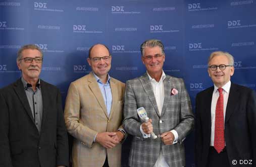 Bildunterschrift: Starker Einsatz für Menschen mit Diabetes: (von links) Martin Hadder, Deutsche Diabetes-Hilfe - Menschen mit Diabetes (DDH-M) Vorsitzender des Landesverbandes NRW, Andreas-Paul Stieber, Ratsherr und Vorsitzender des Gesundheitsausschusses der Landeshauptstadt Düsseldorf, Schirmherr der Veranstaltung, Prof. Dr. Andreas Meyer-Falcke, Beigeordnete für Gesundheit der Landeshauptstadt Düsseldorf und Prof. Dr. Michael Roden, Vorstand des Deutschen Diabetes-Zentrums.