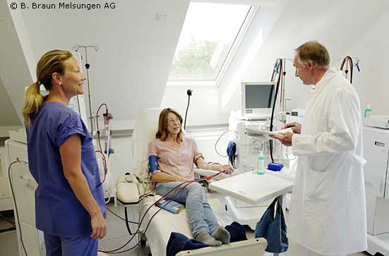Bildunterschrift: Patientin Annette K. an der Dialyse in den neuen Räumlichkeiten im Nierenzentrum Bad Lauterberg eingerahmt von der examinierten Krankenschwester Daniela Tritschler (links) und Nephrologe Joachim Schocke (rechts)