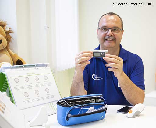 Dr. Thomas Kapellen betreut am UKL etwa 400 Kinder und Jugendliche mit Diabetes. Die meisten von ihnen nutzen eine Insulinpumpe, eine geringere Anzahl den "Pen", eine Art Stift zum täglichen Spritzen. "Die Diabetes-Technologie hat sich weiterentwickelt", sagt er, "moderne Insulinpumpen kommunizieren heute über Funk mit Sensoren, die im Unterhaut-Fettgewebe liegen und dort eine kontinuierliche Glukosemessung vornehmen." Anhand dieser Sensordaten könne die neueste Geräte-Generation Entscheidungen treffen, um Unterzuckerungen zu vermeiden und beispielsweise die Insulin-Dosis zu reduzieren.