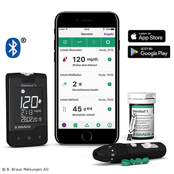 Die B. Braun Melsungen AG bietet seit vielen Jahren Produkte und Dienstleistungen für die Versorgung von Menschen mit Diabetes an - von der Diagnostik über geeignete Therapiemaßnahmen bis hin zu ergänzenden Schulungsangeboten. Die jetzt ausgezeichnete, weiterentwickelte Omnitest- App und das zuverlässige Blutzuckermessgerät Omnitest 5 mit der automatischen Datenübertragung per Bluetooth ergeben zusammen eine digitale Lösung für die einfache Dokumentation und Analyse von Blutzuckerwerten. Die Blutzuckerwerte können via Bluetooth mühelos in die App übertragen werden.