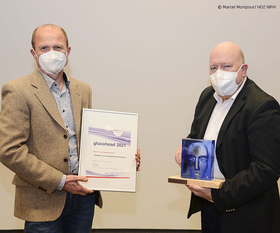 Bildunterschriften: Bild 1: Prof. Norbert Stefan nimmt den glucohead-Preis 2021 von Prof. Diethelm Tschöpe entgegen. Bild 2: glucohead-Preis 2021